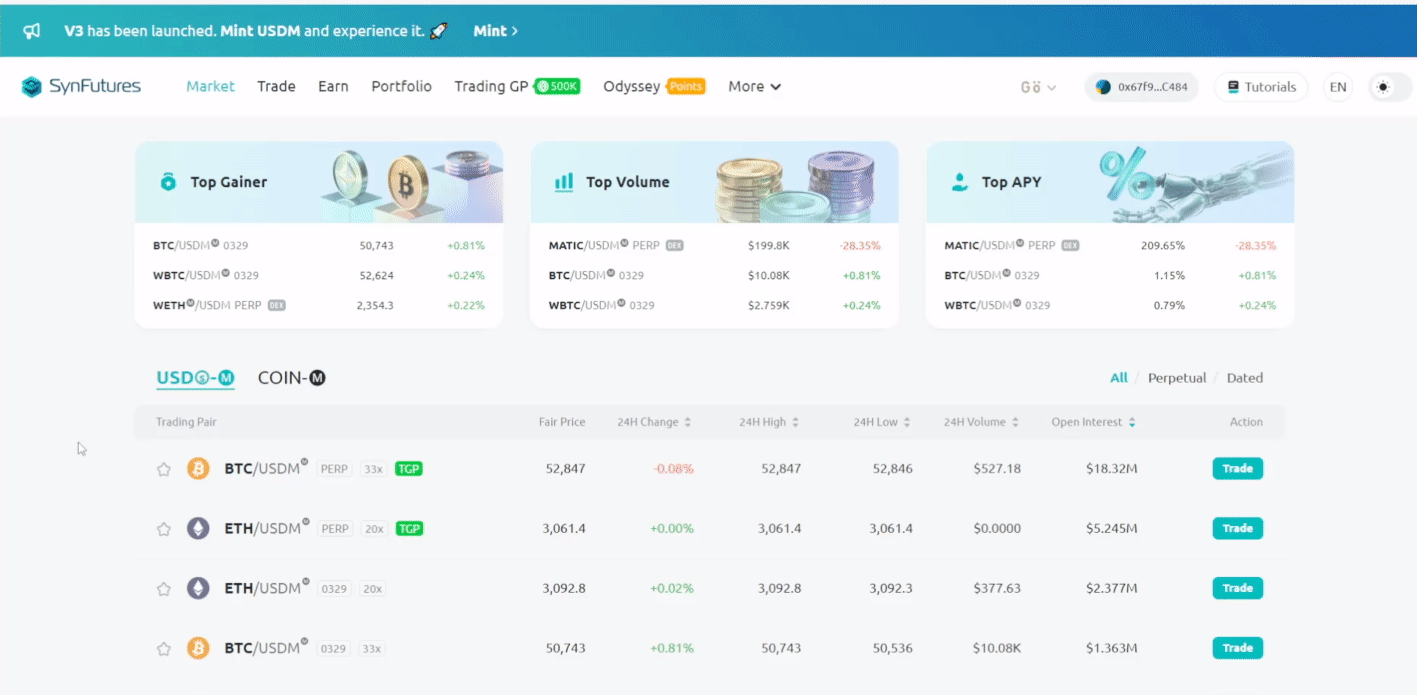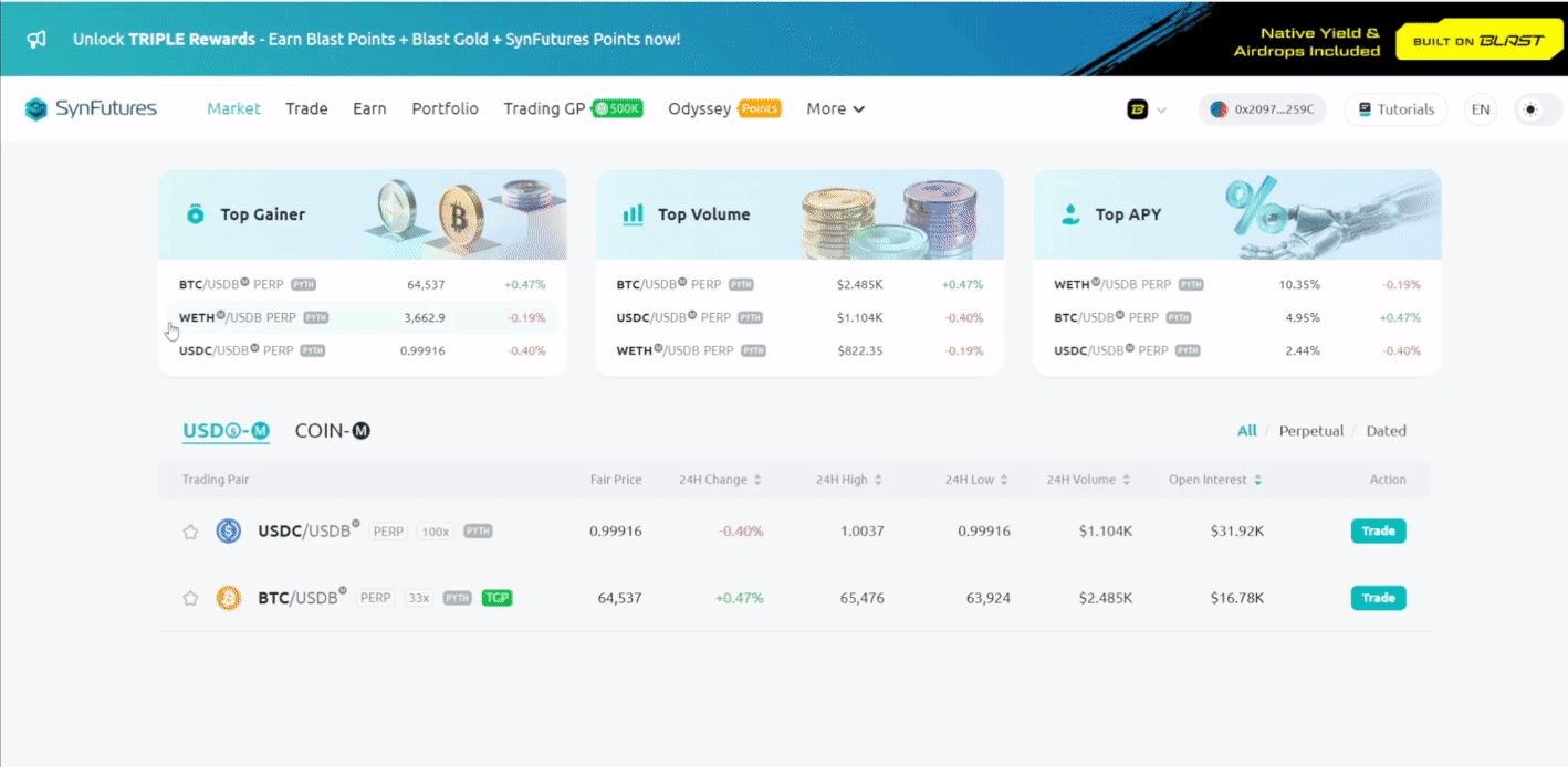 Portfolio: 사용자의 포트폴리오와 SynFutures에서의 이전 활동에 대한 광범위한 개요를 제공합니다.